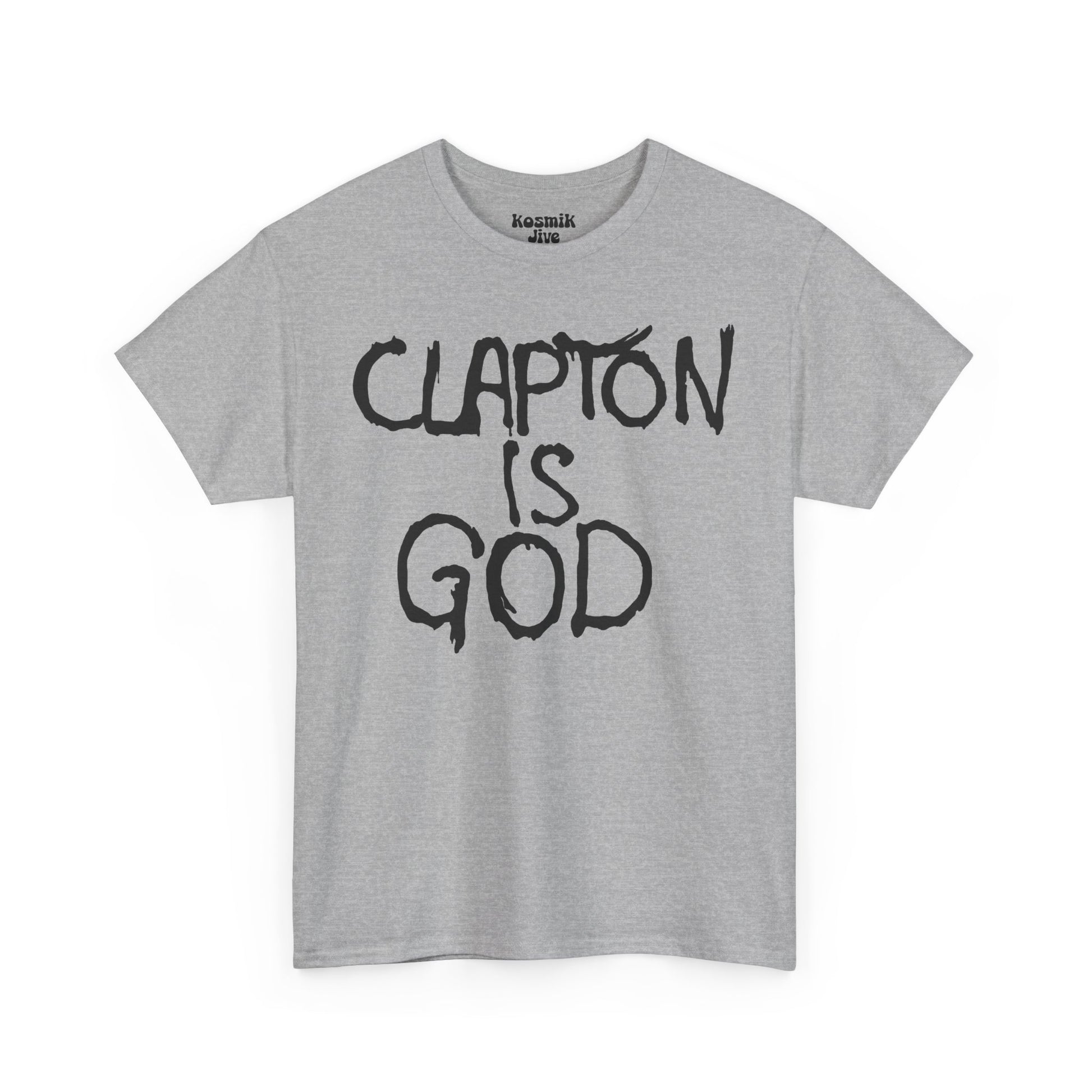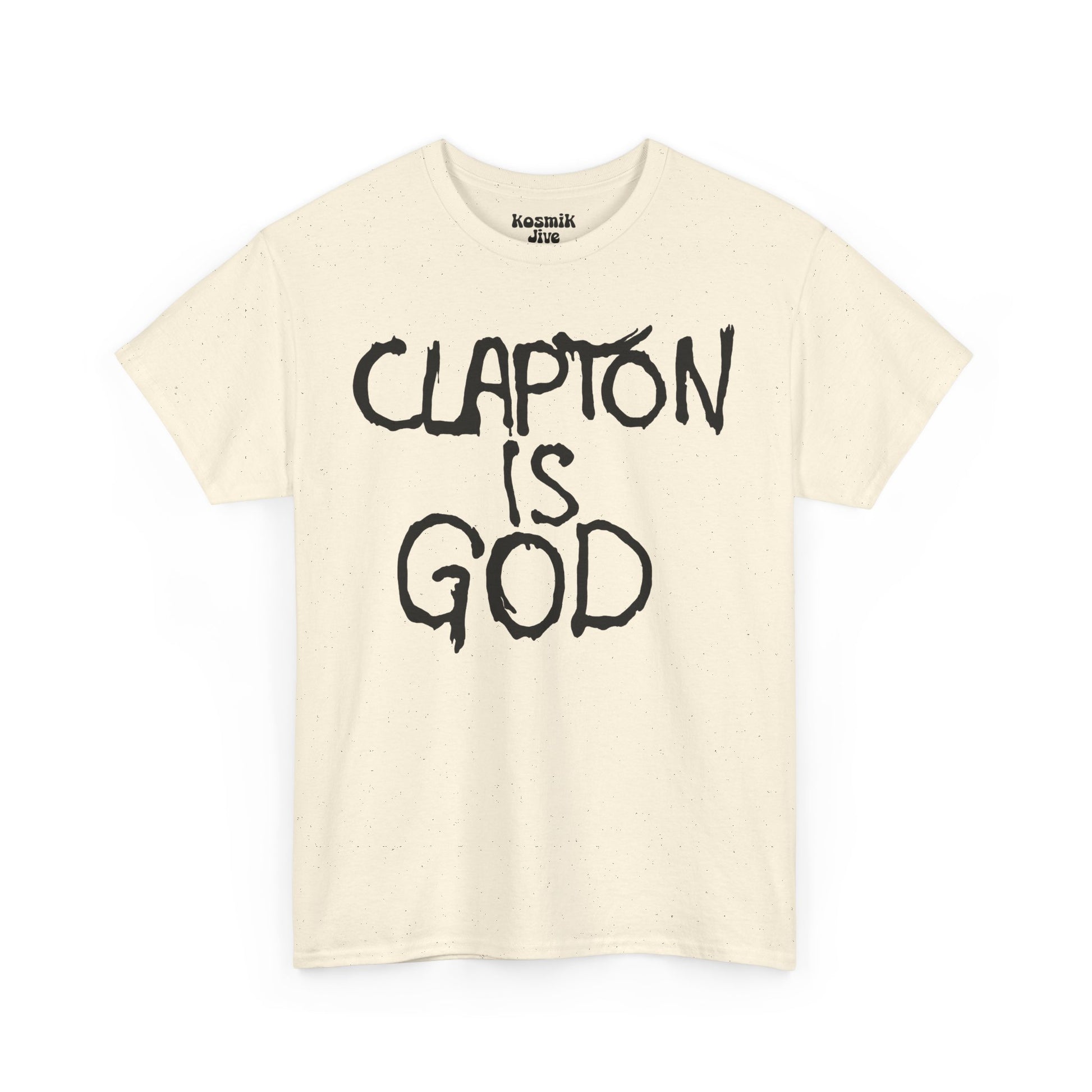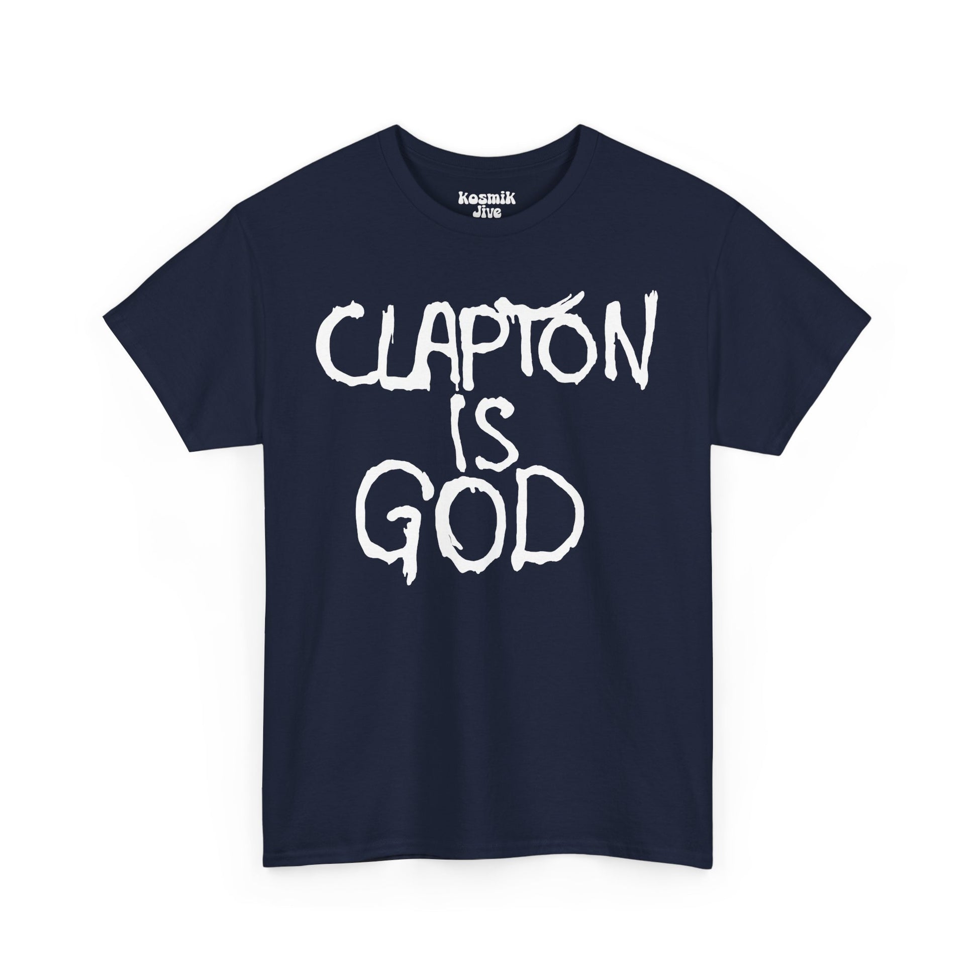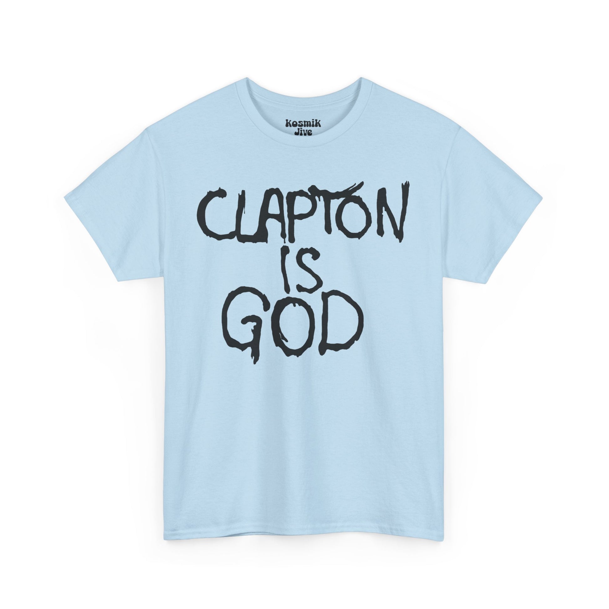 One of the most legendary slogans in rock history, “Clapton Is God” first appeared as London graffiti in the 1960s and quickly became a symbol of Eric Clapton’s iconic status. This bold black-on-white t-shirt recreates the famous phrase that cemented Clapton’s place as a guitar hero.