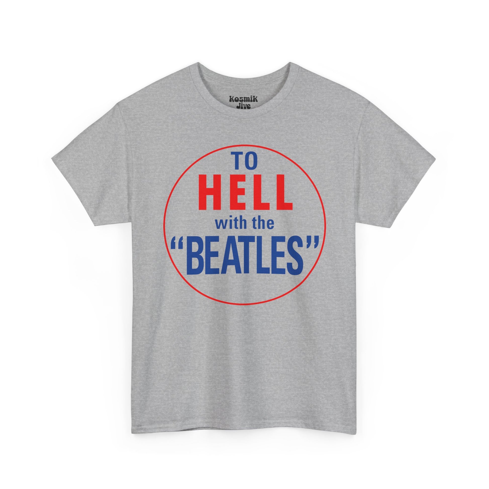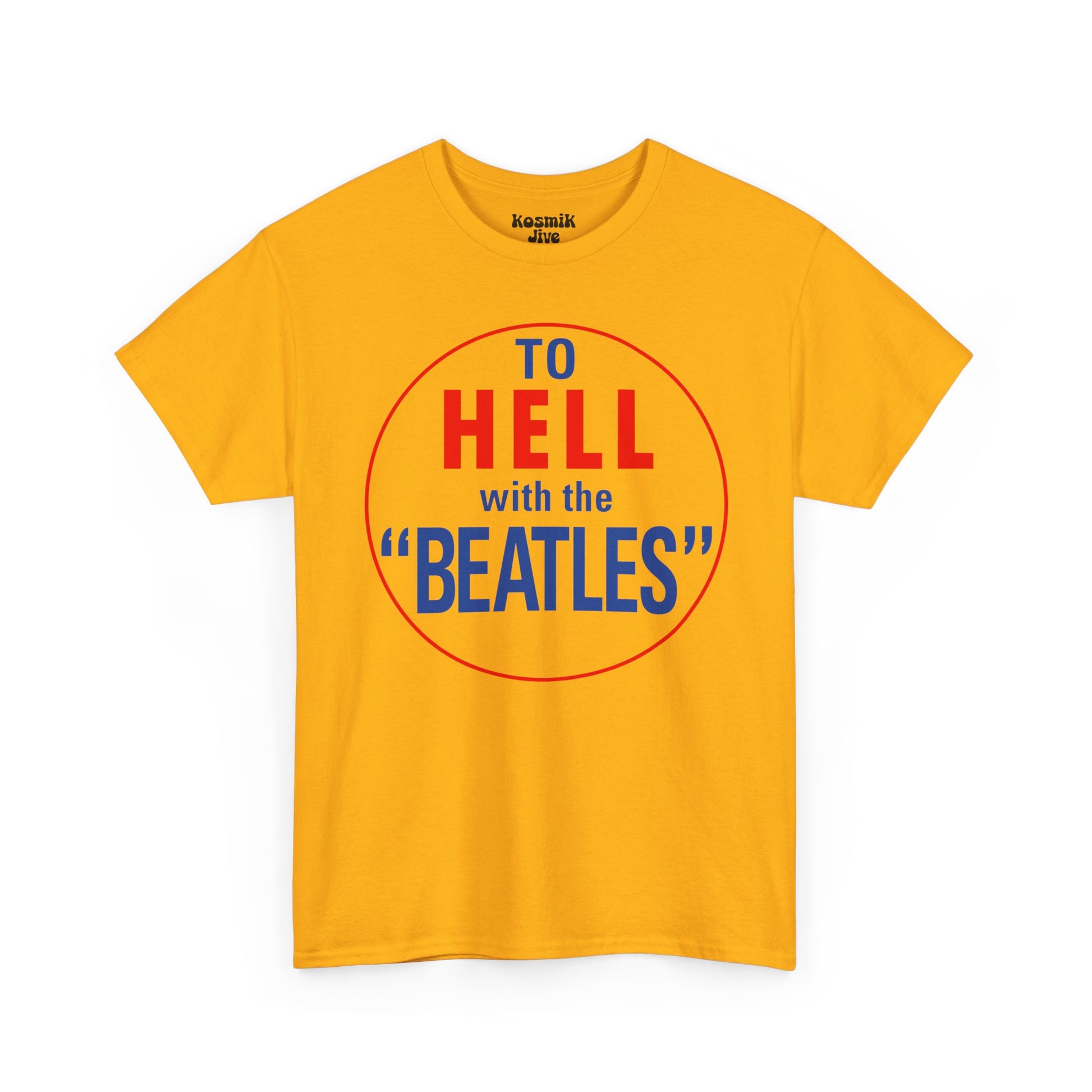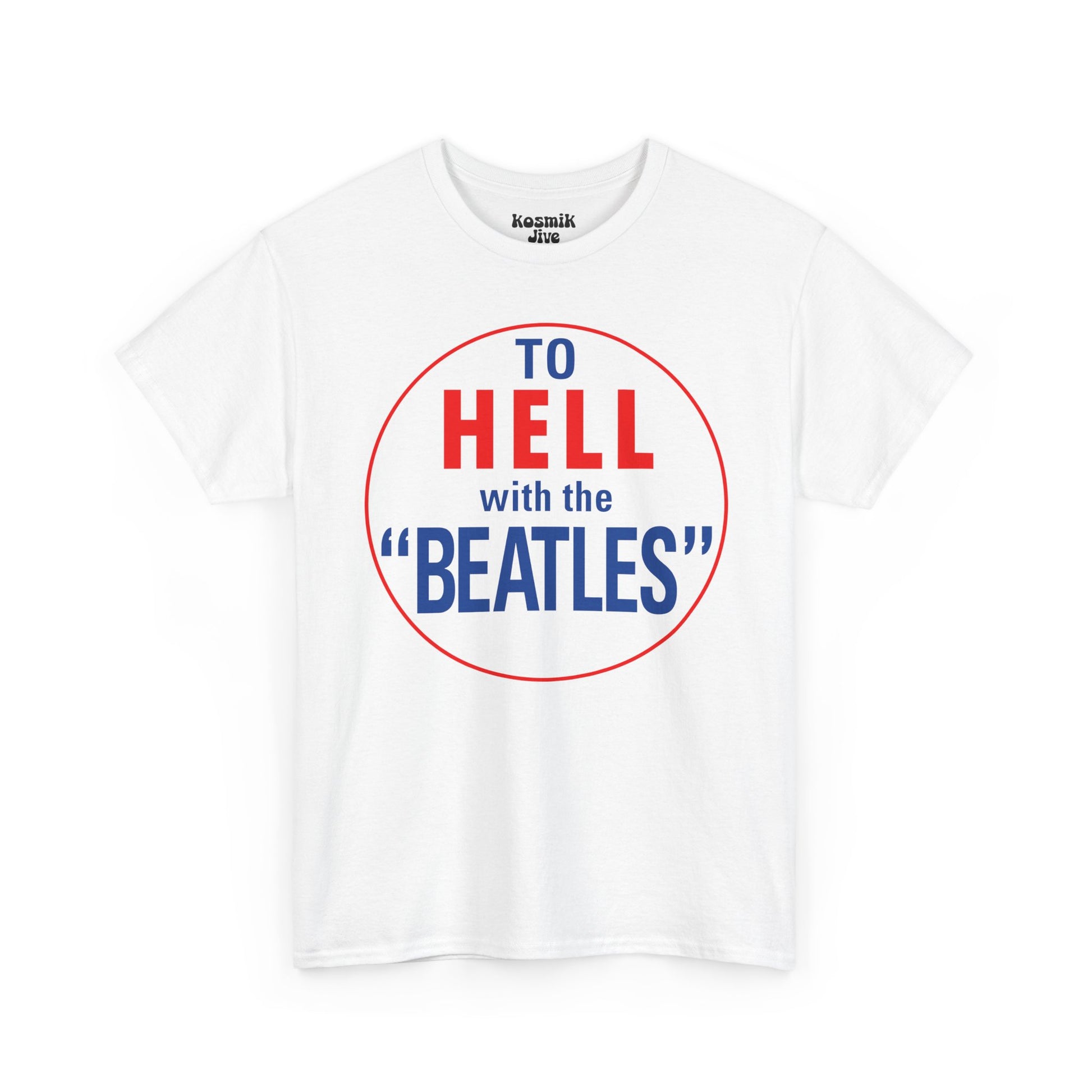 A playful remake of the anti-Beatles protest signs from the 1960s — reimagined here as a tongue-in-cheek piece of rock satire. With bold red-and-blue typography inside a vintage circle layout, this tee is perfect for collectors, humor lovers, and anyone who enjoys the cultural chaos surrounding Beatlemania.