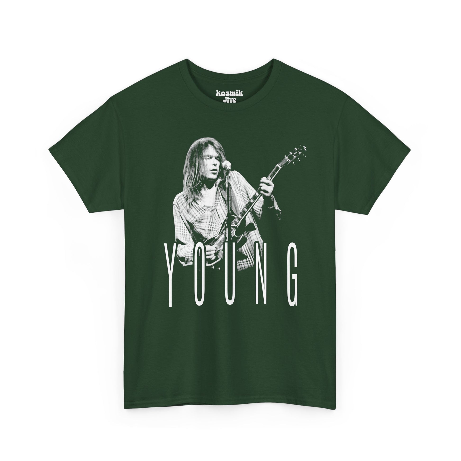 A clean, timeless tribute to one of rock’s most influential storytellers. This design features a striking black-and-white portrait of Neil Young in his classic 1970s stage presence — guitar in hand, eyes closed, fully immersed in the music.